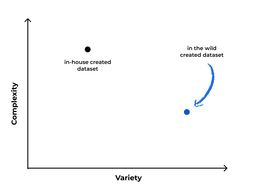Crowd-sourced, in-the-wild data covers the natural long-tail diversity of real scenarios, so models trained on it generalize better and rely less on hidden shortcuts typical of controlled, in-office datasets