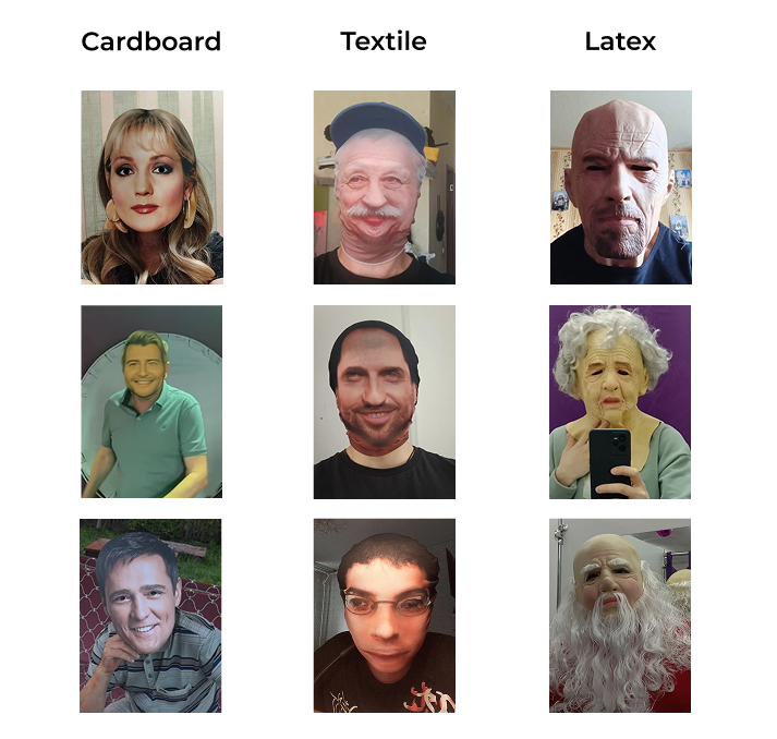 The Face Spoofing in the Wild Multi-Mask dataset provides a practical benchmark for strengthening liveness detection systems under real-world conditions. It brings together three realistic mask-attack modalities – cardboard cutouts, fabric/printed textile masks, and 3D latex masks – captured across varied subjects, cameras, viewpoints, and lighting. This diversity makes it especially useful for assessing, stress-testing, and fine-tuning passive PAD models, an important step toward iBeta Level 2 readiness